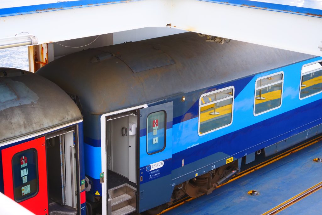 Kann man gleichzeitig zugfahren und schwimmen? Ja! Und zwar über die Straße von Messina. Der Zug wird geteilt, auf eine Fähre gezogen. Man darf aussteigen. Statt Bahnsteig stehen Höckerchen bereit. Eine Etage über den Zügen gibt es einen Bartresen mit Kaffeemaschine und entsetzlich fettigen Snacks, und Holzsitze, die an die Bestuhlung einer Schulaula erinnern. Ich entscheide mich aufs Sonnendeck zu stellen und genieße den Wind und leichten Nieselregen aus hellgrauen Wolken, die sich mit dem schwarzen Ruß aus den Schiffskaminen mischen, bis eine Durchsage und resolute Begleiter die Passagiere wieder in ihre Züge schicken.