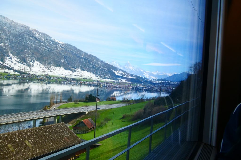 Dann zeigt die Schweiz mit weißen Zacken am Zugersee ihre Schönheit: Felsen, Schnee und Sonnenschein. Ich fotografiere aus dem Fenster. Bellinzona. Blauer Himmel, bunte Häuser an grünen Hängen.