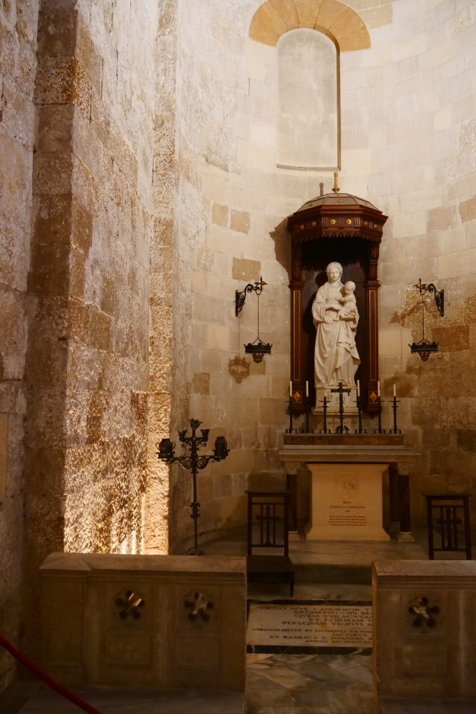 Die Kirche wurde im 7.  Jahrhundert aus einem griechischen Tempel für die Göttin Athene umgebaut, dem größten griechischen Tempel Siziliens. Im Inneren sind noch die originalen Säulen der Tempelwände sichtbar, außen sind die dorischen Kapitelle schon rund abgeschliffen. Der Bau vereint architektonisch griechische Säulen und Romanik . Davor hat man eine Barockfassade montiert, die aber gerade eingerüstet ist.