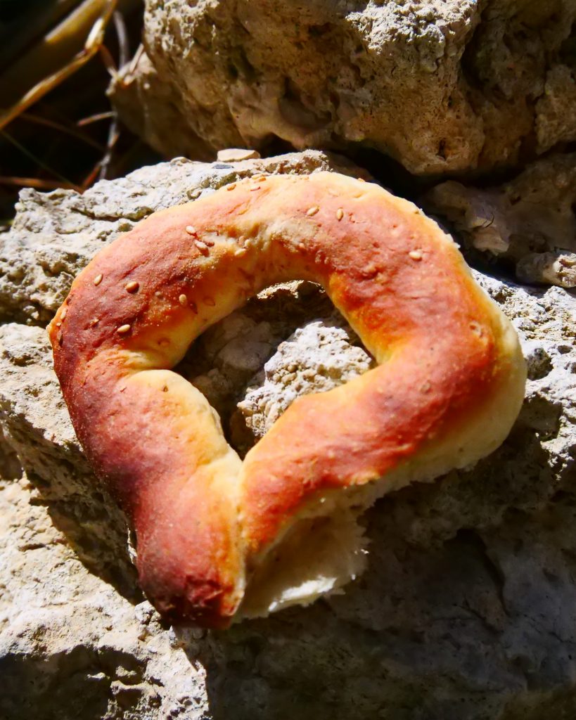 Der Innenraum ist dunkel und fensterlos. Ein älterer Herr sitzt in seiner Mitte. Aus einem anderen Raum kommt die ebenfalls betagte Bäckerei. Ich kaufe unheimlich leckere Sesamkringel mit Fenchel- und Honiggeschmack vom Blech. Sie sind noch warm. 20 Cent kostet das Stück.