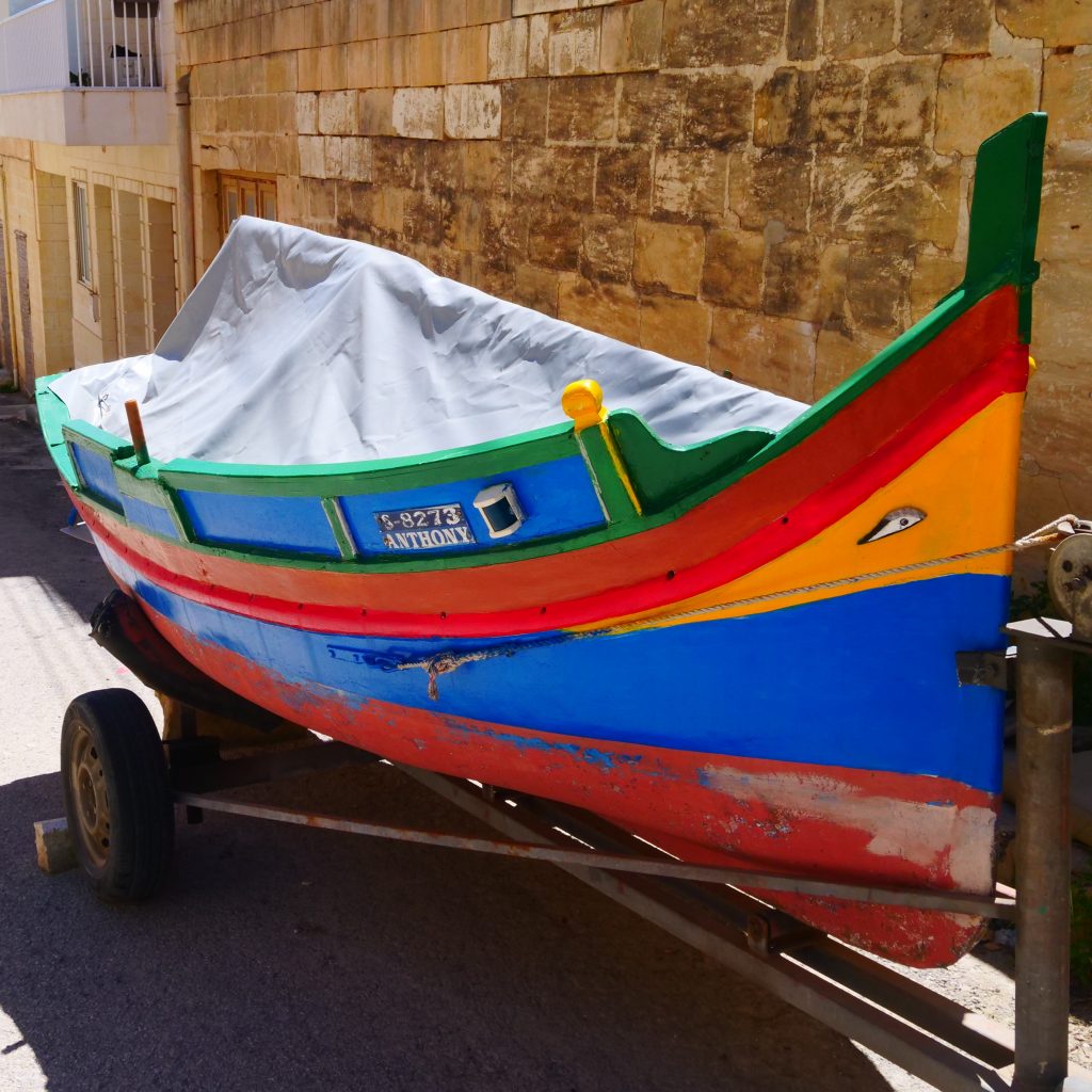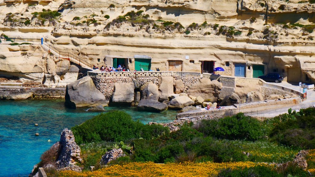 Der befestigte, steile Triq Għajn Ħaġar führt Richtung Meer auf den Küstenpfad. Und der wiederum bringt mich zur Qorrot-Bucht mit in den Fels gehauenen Bootshäusern mit bunten Toren. Der Strand ist klein, aber gemütlich. Es gibt außer einem Toilettenhäuschen keine Infrastruktur. Ein wunderschöner Platz, um zu baden.