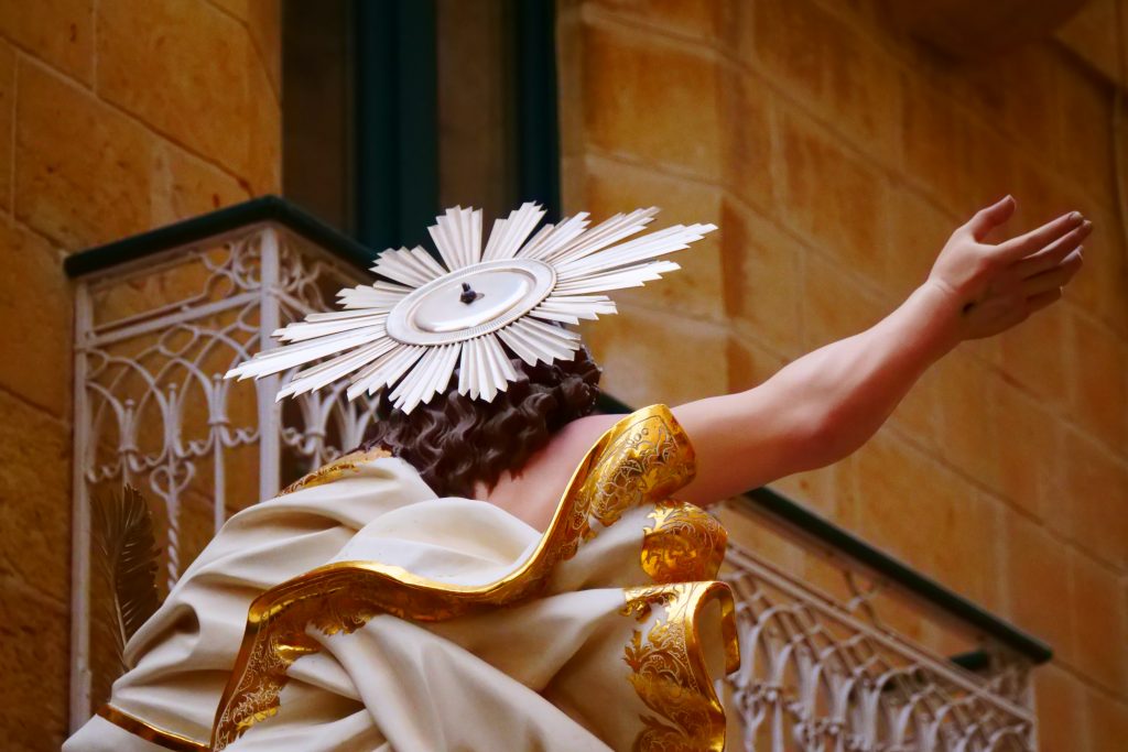 Heute bin ich um 6:30 Uhr aufgestanden, um den Bus zu erreichen und rechtzeitig zur Osterprozession in Victoria/Rabat zu kommen. Am Zielort angekommen, wartete ich darauf, dass sich das Portal öffnete. Eine Kapelle bereitete sich vor. Zwei Fahnen wurden entrollt. Zwei Jungen standen mit Ohrenschützern in den Glockentürmen. Die Glocken begannen zu läuten – erst mit einzelnen Schlägen, dann schneller. Während des Wartens spürte ich einen freudigen Druck in der Brust. Die einzige Erklärung dafür ist „Ergriffenheit“. Ich bin nicht katholisch, die Rituale sind mir fremd, und doch hat mich die feierliche Stimmung ergriffen.