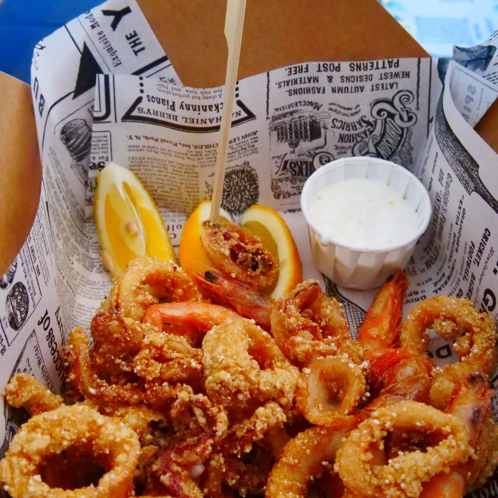 Als ich die Kuppe erreichte, war es mit der Einsamkeit vorbei. Auf dem Parkplatz außerhalb des Trubels aß ich unter einem Sonnenschirm mit tollem Blick auf den Fungus Rock frittierte Calamares und Garnelen.