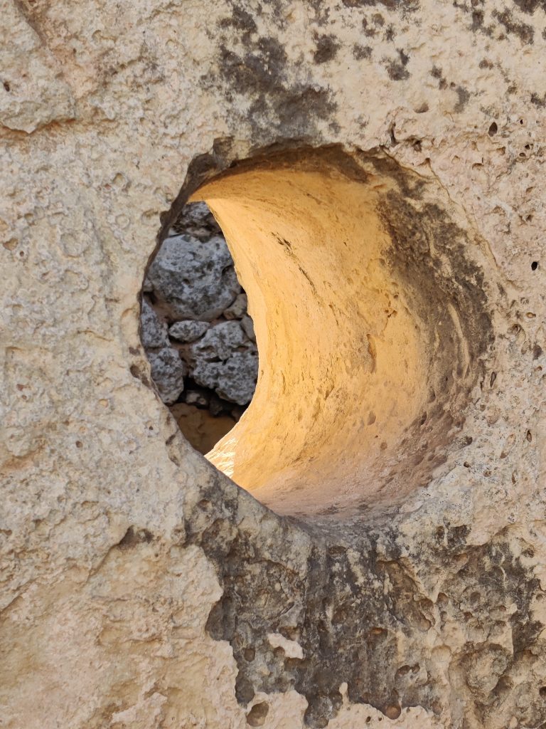 Oben in Ix-Xagħra angekommen, betrete ich einen Eingang, über dem ein gelbes Schild angebracht ist. Er wirkt, als führe er in ein Wohnhaus: Eine weiße Sitzbank, gefliester Boden, eine Glastür und ein Schild, das die Grotte als geöffnet ausweist. Ich drücke auf die Türklingel. Eine junge Frau kommt mit dem Schlüssel. Ich entrichte drei Euro und frage, wie man den Namen Xerri ausspricht – er klingt wie Cherry, wie Kirsche. Ich steige eine schmale Wendeltreppe hinab, die den Durchmesser eines Brunnenschachts hat.