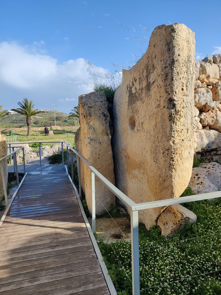 Der Tempel besteht aus riesigen Steinblöcken, die die Erbauer mit vulkanischem Glas und Obsidian aus dem Felsen schnitten, teilweise verzierten und mit runden Löchern versahen. Einzelne Steinquader wiegen bis zu 50 Tonnen – so viel wie 15 übereinander gestapelte SUVs. SUVs gab es im Neolithikum ebensowenig wie Schwertransporter. Die Erbauer rollten die Megalithen auf Steinkugeln zur Baustelle. Einige dieser Kugeln, die an Kanonenkugeln erinnern, liegen noch heute vor der Tempelanlage in Ix-Xagħra. Beide direkt nebeneinanderliegenden Tempel erinnern in ihrer Grundform an ein Kleeblatt.