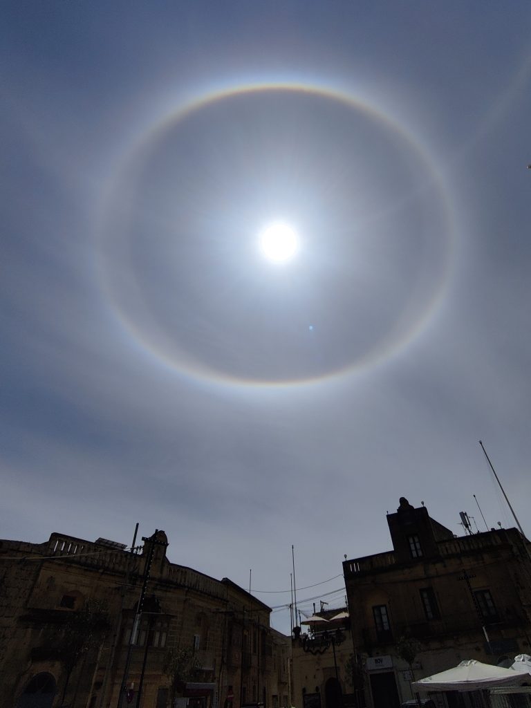 An der Erdoberfläche zurück gönne ich mir ein Kinnie, eine Bitterorangenlimonade. Leute in den Restaurants auf dem Kirchplatz zeigen aufgeregt nach oben zur Sonne. Ich sehe einen Ring in sanften Regenbogenfarben, der sich als Heiligenschein um die Sonne gelegt hat.
